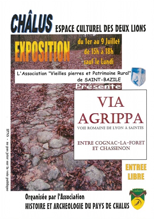 Du 1er au 9 juillet 2017 : Exposition "Via Agrippa, voie romaine de Lyon à Saintes" présentée par l'association des "Vieilles Pierres et Patrimoine Rural de Saint-Bazile". Un travail remarquable qui a permis aux visiteurs de découvrir une partie de cette voie entre Cognac-la-Forêt et Chassenon. L'occasion d'avoir un oeil nouveau sur la nature et les sentiers de ce secteur. Merci à l'intervenant pour ses intéressantes explications et au travail réalisé par les bénévoles de cette association