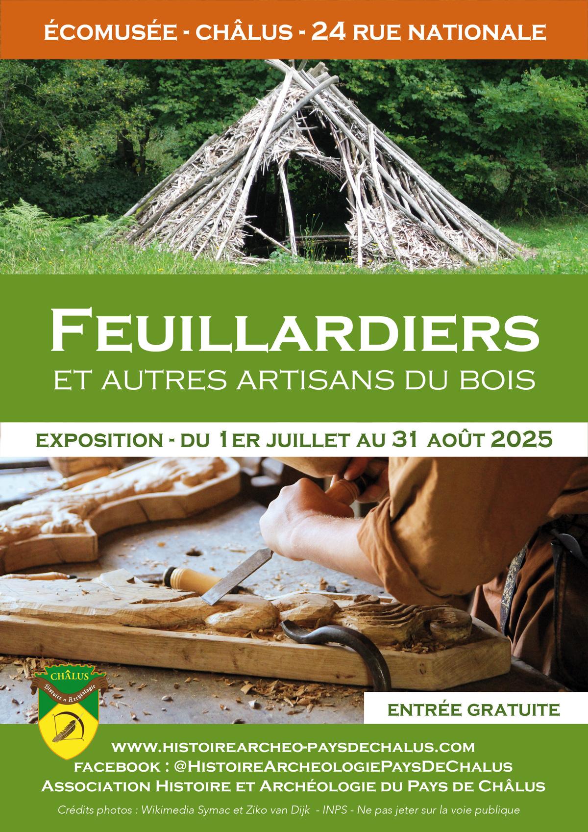 Inaugurée le mardi 1er juillet 2025 en présence des élus de la commune de Châlus et de membres de l’association, l’exposition thématique de cette année était dédiée à ce métier typique de notre territoire : les feuillardiers, que nous avons associés aux autres artisans du bois d’hier et aujourd’hui. Outils, réalisations, maquettes étaient issus de notre collection ou prêtés par les artisans locaux : M. Lajudie (feuillardier à Pageas), la société Approbois (située aux Cars), Antoine Besse (artisan contemporain à Saint-Laurent-sur-Gorre).